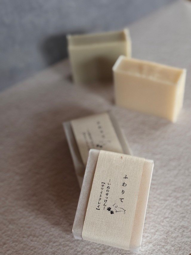 ・・・・・・・・・・・・・・・・・・・・・・・・・・・・・・・・・・・・・・・・ ワンちゃんの皮膚は人間と比べるととってもデリケートだから、あなたの手で、ふんわりと優しい泡で、ワンちゃんを包むように洗ってあげて欲しいと願って作った石けんです。 成分は、天然オイルや国産純正ラード、天然クレイといった、ワンちゃんにも安心安全な原料のみ。合成界面活性剤や合成保存料等は一切使用しておりません。 ワンちゃんのみならず、環境にも優しく作られています。 優しい泡立ちで洗い上がりの香りも心地よく、泡切れもとても早いので、シャンプー時間の時短にもなります。 ワンちゃんのお風呂時間がより楽しくなる「ふわりて」。 是非一度お試しください。 ・・・・・・・・・・・・・・・・・・・・・・・・・・・・・・・・・・・・・・・・ ■ホワイトクレイ オールマイティーのワンちゃん向け。 クレイの中でも一番作用が穏やかなので、初めて使うワンちゃんでも安心。乾燥肌のワンちゃんにもお使いいただけます。 ■グリーンクレイ ショートコートやスムースコートのワンちゃん向け。 汚れや匂いを吸着する力に優れているので、すっきりさっぱりと洗い上げたい場合におすすめです。 ※タイプ分けはあくまでも目安ですので、飼い主様のご判断でお買い求めください。 ※稀に石けんにクレイの溶け残りが粒となっている場合がございますが、品質には問題ございませんので安心してご使用ください。 ※こちらの製品の使用によって何か問題が生じた場合に適用される「生産物賠償責任保険(PL保険)」に加入しております。 ※「ふわりて」は犬の皮膚・被毛洗浄用の石けん(雑貨石けん)です。人の皮膚に使用する石けん(化粧石けん)ではございません。 ・・・・・・・・・・・・・・・・・・・・・・・・・・・・・・・・・・・・・・・・